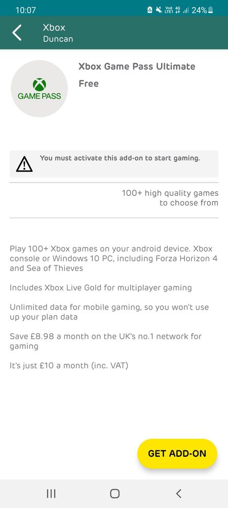 So when i upgraded my phone,I was enttitled to xbox game pass for 12 months. Wasn't the reason why I got this phone though. I checked in add ons and shows its there. It says that I have to pay £10 pm is that correct and I've missed read something? Or do I have to wait for a text myself ?